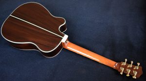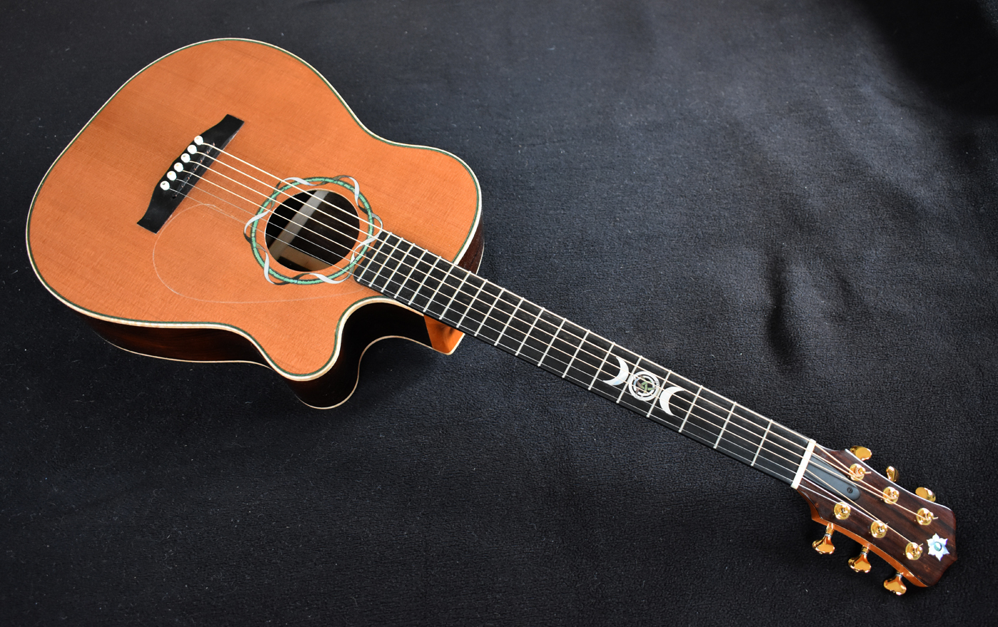 Grandmother is the third instrument I have made for artist Tracy Spring of Bellingham, Washington. As a musician ages, their instrument can become harder to play. The concept for this guitar was to make an instrument that Tracy could easily play well into her elder years. This guitar has a small body and a short scale, which makes it comfortable and easy to play. My task as a luthier was to design an instrument that although small, can produce a lot of sound. I used red cedar for the soundboard because it is a light and responsive wood, and cocobolo for the back and sides for power and clarity.