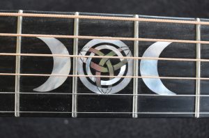 This inlay of the triple moon represents the three phases of a woman’s life: Maiden, Mother, and Crone. The Triquetra in the center is a form of Celtic knot.