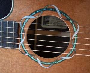 The soundhole rosette is an area of the guitar where I get to have some artistic fun. This is an example of my ribbon and ring design that I have used on several other guitars. The ribbon of light and dark mother-of-pearl appears to go over and under the glass ring.